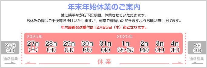 2025年12月27日(土)〜2025年1月4日(日) の期間、休業をいただきます。