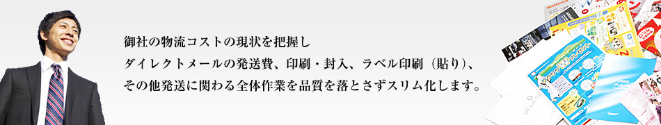 弊社では、お客様からお預かりした印刷物及び発送物を同業他社より安価に、確実に作業を行い、お客様に代わり郵便局やヤマト運輸などの各運送業者に投函する事で格安に発送することが可能になるサービスです。発送費用を抑えられる秘密は、年間1,000万通を超える発送を行っている弊社だからこそできる各運送業者との費用契約を安く抑えられるからです。